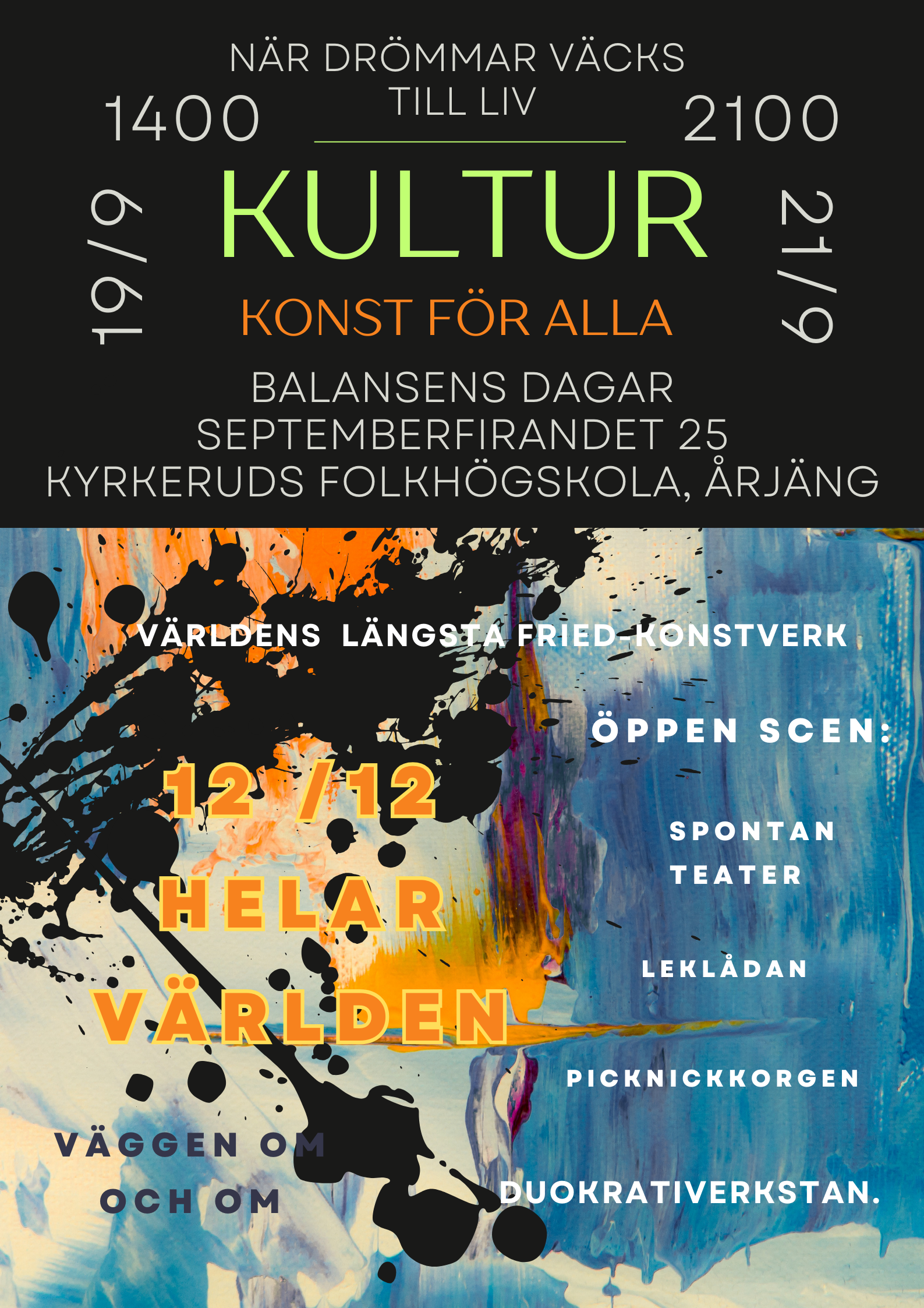 Det är en stor ära att få samordna detta sedan åtta år efterlängtade firandet i hjärtat av kultursamskapandets konst-folkhögskolemecka, Kyrkerud. Må nu våra innersta och vackraste drömmar få liv och skina över mörka skyar och bistra länder.